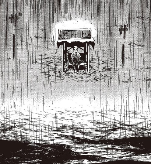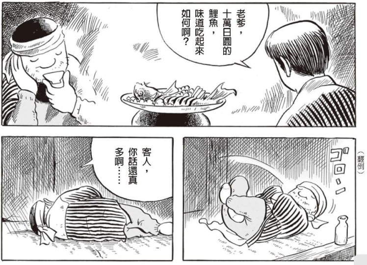 女主一人开始冒险,走向《混沌洞的笨先生》篇章(原名《ほんやら洞のべんさん》,台版收录于《柘植義春漫畫集:枯野之宿、窗邊的手》)。山中旅馆应该是义春最常见的题材,剧中列车穿过隧洞进入雪中世界,一瞬间很像雪国(我喜欢这个镜头)。